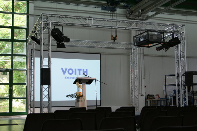 01.07.2010: Einweihung neue Niederlassung Voith Turbo in Rostock-Marienehe, hochwertige Moderationsbeschallung mit Delay-Line und Projektionstechnik mit 15.000 ANSI-Lumen